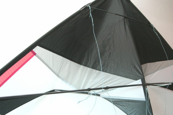 The T5 proves that a team kite doesn't need to pull like a train; what's needed is consistent pull in different wind conditions and this design delivers. SkyShark P200 frame with SkyShark Nitro spreaders. Reverse turbo bridle in Marlow marine racing. Optimised for 4-15 mph wind or a little more if used with brakes. The P200 frame is team-oriented; you can specify a stiffer frame if you want a more 'snappy' feel for solo flying. Price is £220 Email to order or for more information