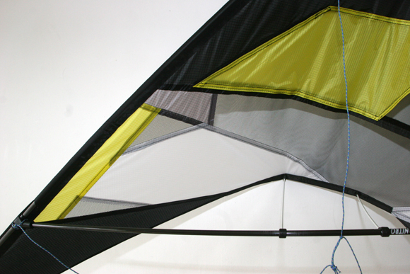 Compared with the V1, there's a much larger main vent panel and 2 additional mesh panels. The main panel has a rip-off so the amount of venting can be varied. With the rip-off in place the kite will fly in as little as 10 mph; remove the rip-off and the kite works up to 30+. SkyShark P400 and Nitro spreaders; Chikara fabric for outstanding durability. Price is £280 Email to order or for more information