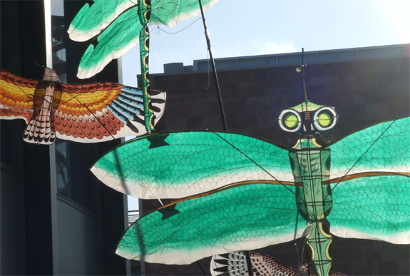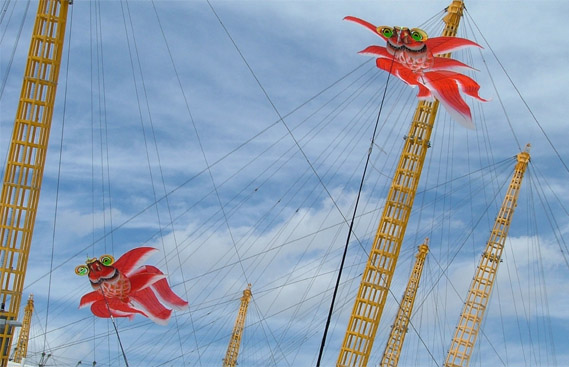 Projects and eventsIndoor RecordsWe've set a number of STACK-recognised world records for indoor flying. Way back in '98 we set some of the early indoor records - just over 3 hours for a solo flight, by Greg Eynon using a Diva kite; then a 3 hour 33 minute 33 second relay - also with the Diva. (These are for continuous flying - no help, no landings or ground contact) As a build-up for these I set a record flying 2 kites - just 18 minutes, but it was a first attempt. I was persuaded to make a serious attempt for the Hereford Millenium Kite festival; we built a pair of special purpose indoor kites (the DaDa) and managed just over 58 minutes. Time TeamWe took part in one of the Time Team TV programmes, working on an historical reconstruction of the Roman Draco at Drumlanrig in Dumfries.There are just a few references to the Roman Draco standard. It was supposed to make an eeirie noise - perhaps an early form of psych warfare? Although an example of the Draco head has been found, there's no firm evidence for how the Draco made the noise, so our job was to experiment with various methods that might have been used, and come up with a 'most likely' fit. We settled on using an array of the Chinese flutes like the ones used on whistle kites. They are made from gourds and work at low pressure, so probably should be called flutes. We used a range of sizes tuned to produce a discord - hence the eeire effect. Really, just 2days to get it working, ready for filming on day 3 - and while I was working on the noise, Valerie was hand-sewing the Draco tail, using silk. In the end, a pretty successful experiment; the noise was loud enough to be heard 1km away so although it's not proof, it's a pretty plausible hypothesis. More information: http://www.fectio.org.uk/articles/makedraco3.htm New Year display at Coventry UniversityChinese kites at the O2 ArenaDragon kites for Glasgow MuseumGlasgow Museum used two of the super-large dragon kites as themed decorations for the entrance to the exhibition of Chinese culture. Wing project for Magna Interactive Science CentreWe were comimssioned to build a stylised wing which needed to double up as a projection screen. The challenge was to produce something over 3m wide, to remain totally flat and to weigh less than 2Kg. Oh, and it had to pack flat and be assembled on site under hard-hat conditions. The final design was executed in Chikara and 6mm Carbon/Kevlar tube forming a virtual torsion box with the fabric forming part of the structure. Aerial FiestaOur trip to the Emirates where we organised the kite display for the Al Ain Aerial Fiesta.